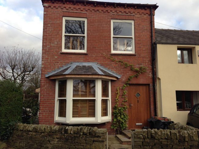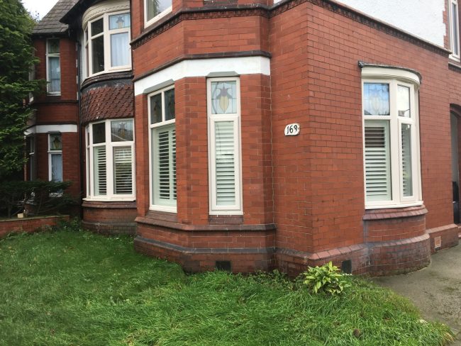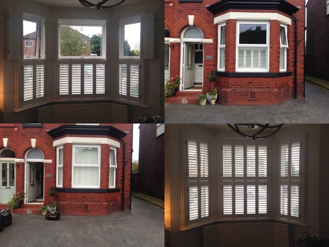 One of a few Café style shutter installs we have done recently, this was one 3 sided bay, one 4 pane curved bay and one small 3 pane curved bay window – in Trafford, Urmston.