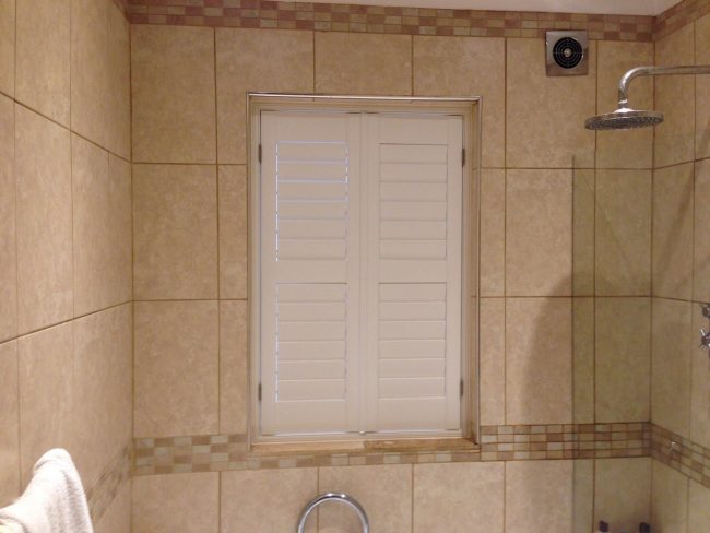 Hardwood shutters can withstand most moisture & water, but for windows like this one in the shower, our 100% waterproof polyvinyl shutters are the perfect choice 🚿