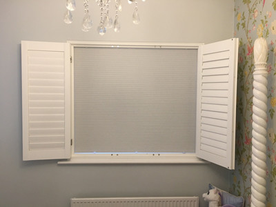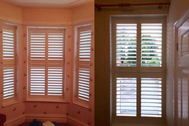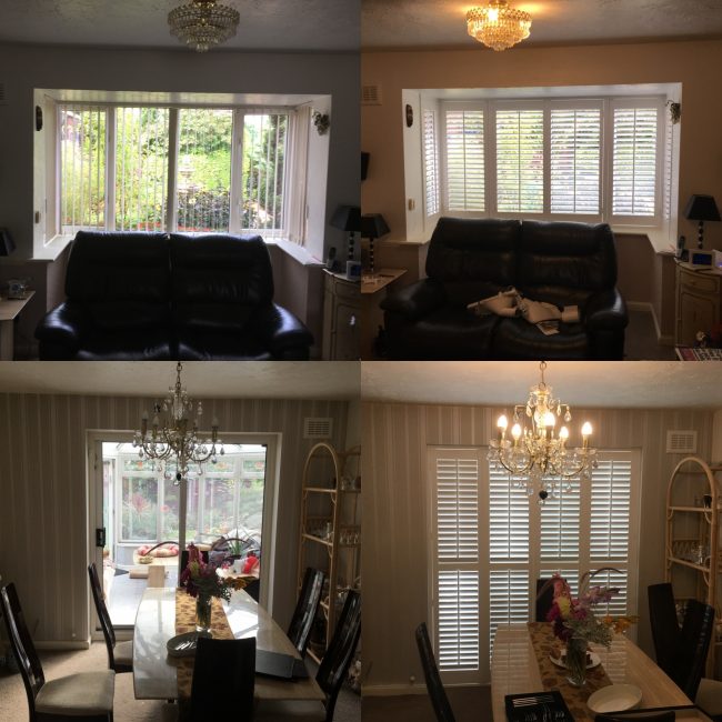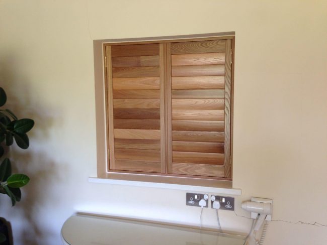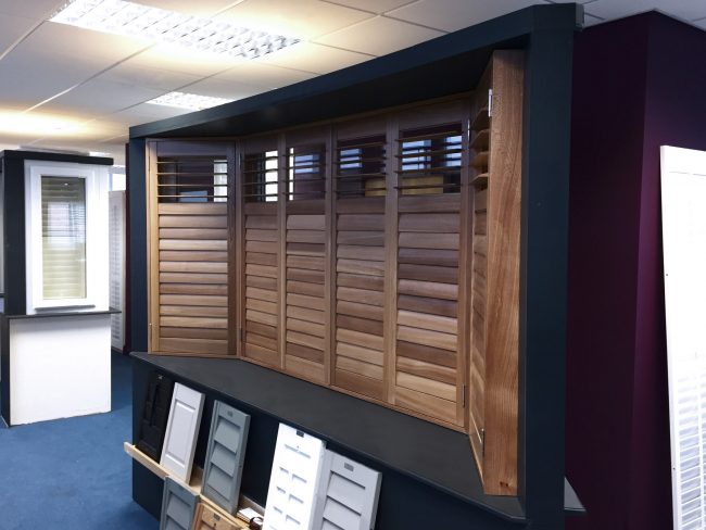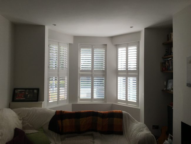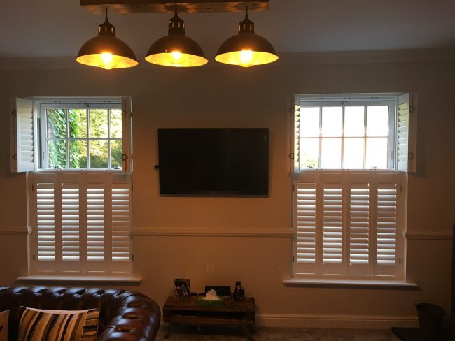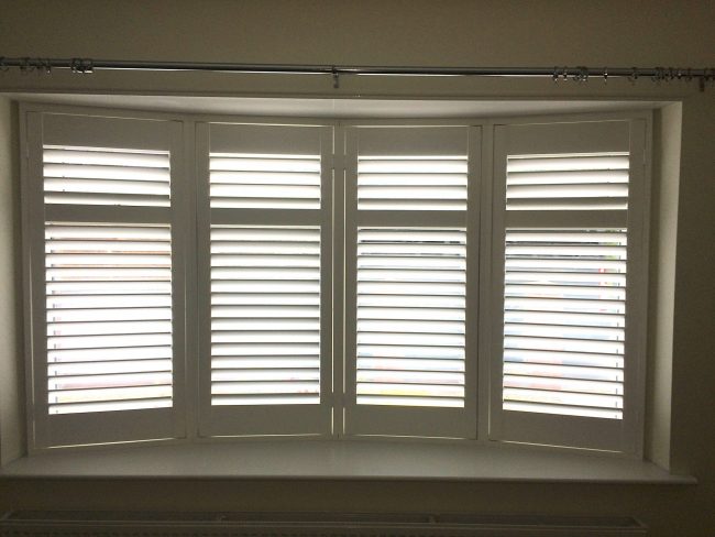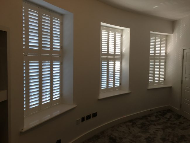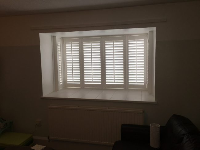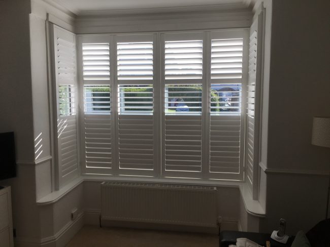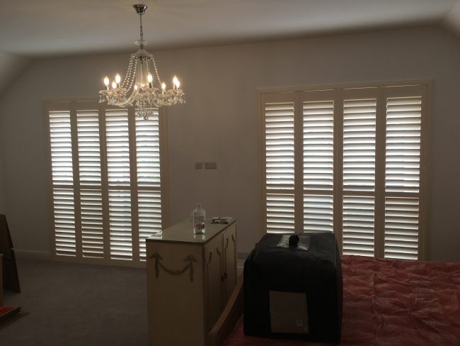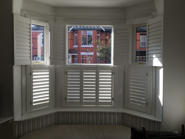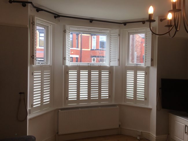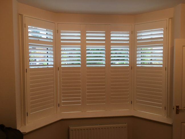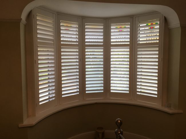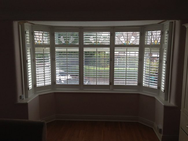 5 windows at the front of this house in Wilmslow fitted with wooden shutters this week – 1 flat window and 4 bay windows – with hidden pushrods & concealed splits in the louvers.