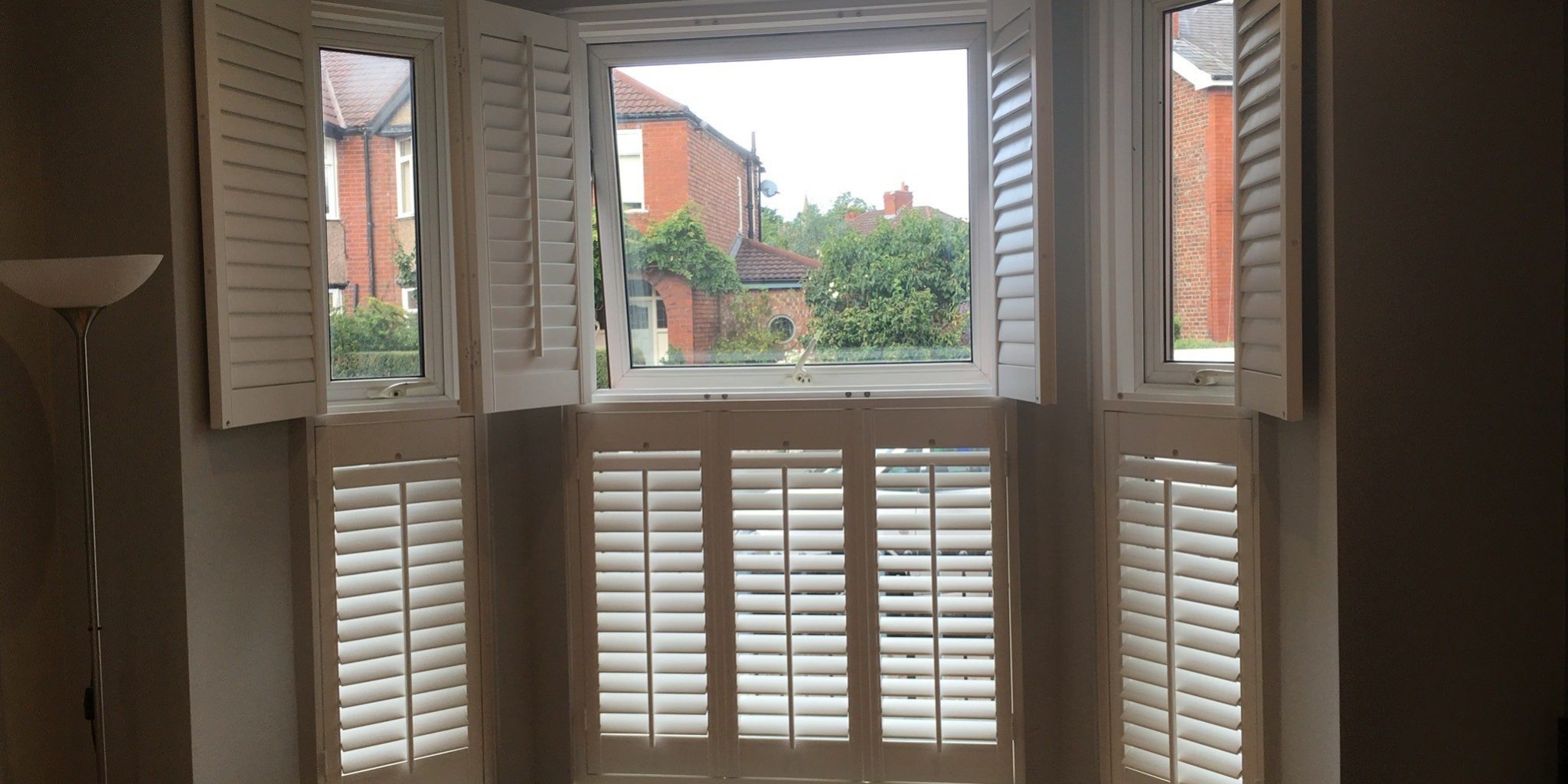Before & after of the first of two planation shutters installs in Manchester – A large 3 sided bay window fitted with hardwood poplar, tier on tier planation shutters – in bright white for contrast against the grey walls and classic front push rods to match the style of the property π