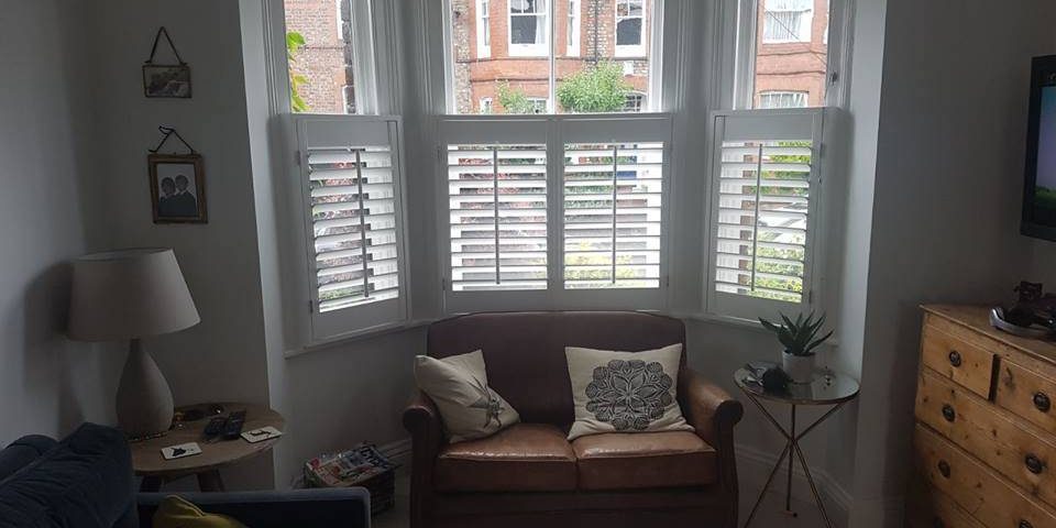 Another recent Cafรฉ Stye Shutter Install for this large bay window, a nice finishing touch for this beautifully clean interior
