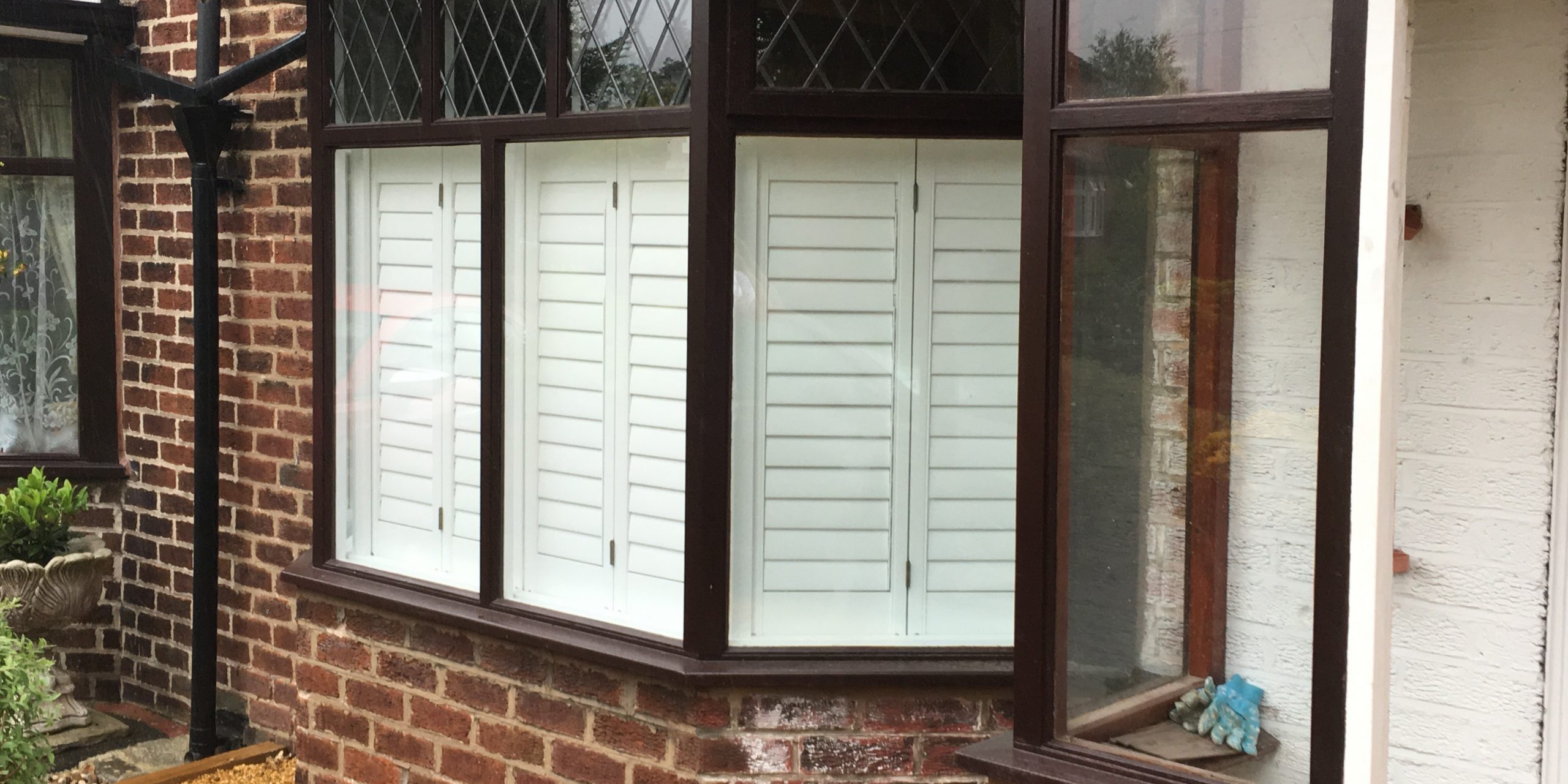 A delighted customer in Cheadle Hulme, not far from our Showroom. Look at the difference in privacy for this street front, 3 sided bay window now it has been fitted with our Cafรฉ Style Shutters.