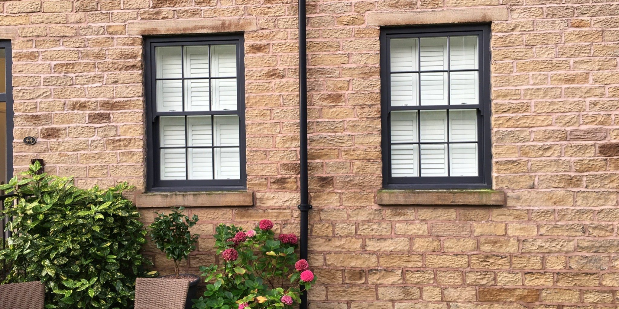 Hardwood shutter installation this week: Two flat sash windows fitted with white tier on tier shutters in Horwich, Bolton – ❤️ the look of these windows from the outside!