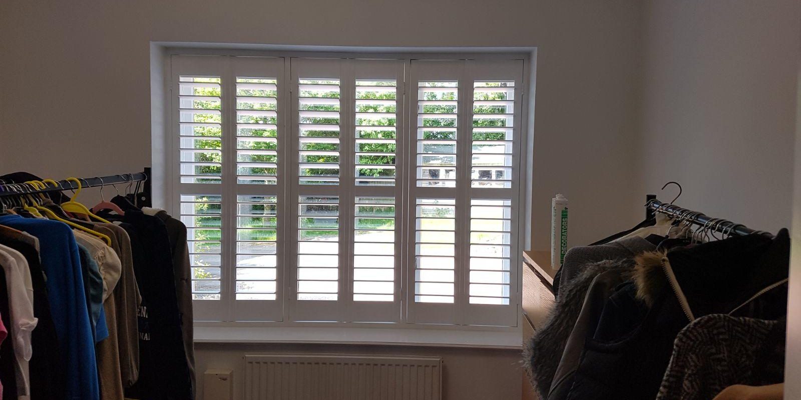 Shutters for added privacy in this walk-in wardrobe / changing room – you can shut the bottom slats for privacy and keep the top ones open for light when you’re getting changed