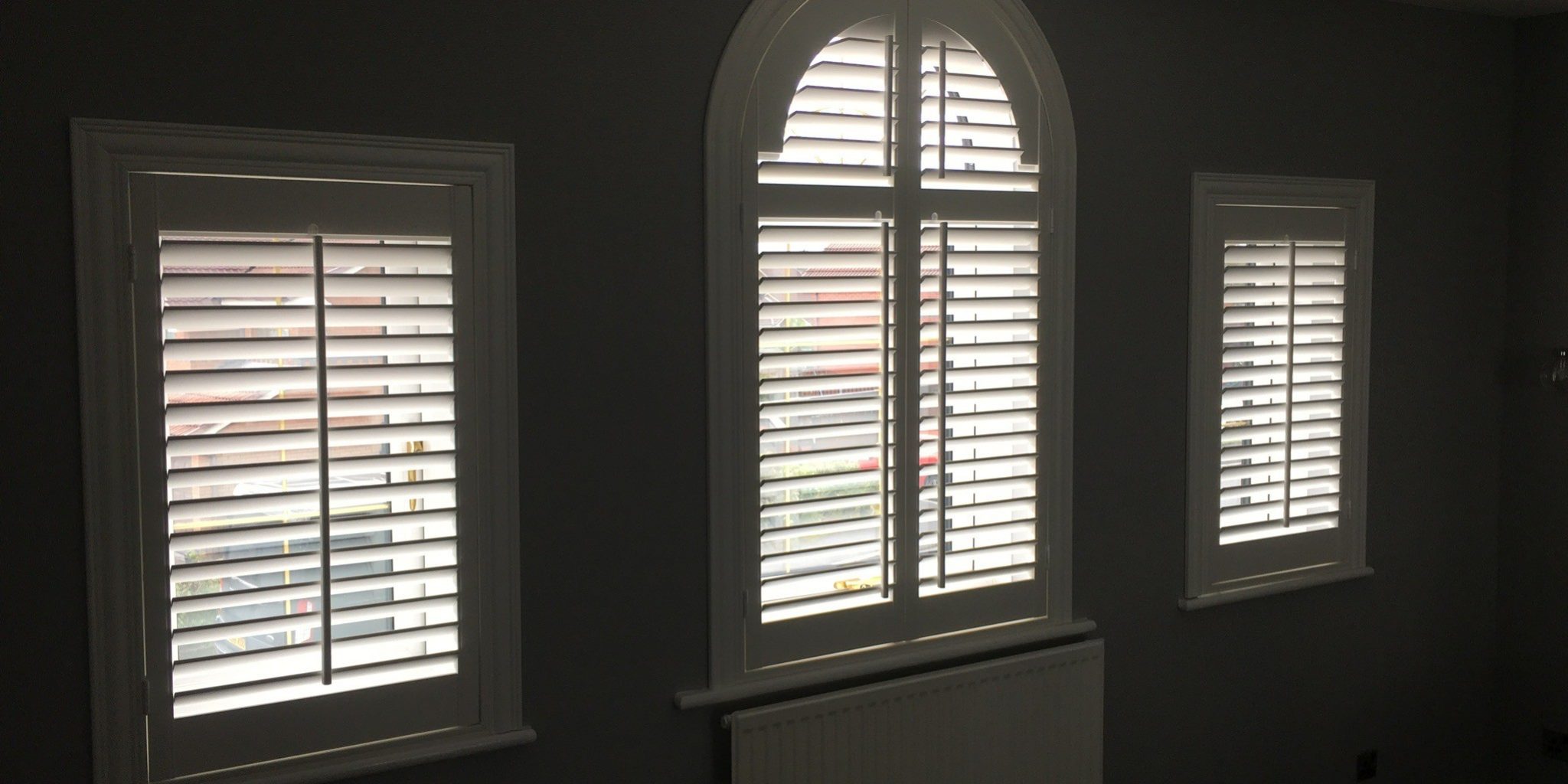 β€οΈ everything about this room in Middleton, Manchester! Love the contrast of the grey walls & white shutters and love the symmetry of the two standard windows with the arch window in the centre π